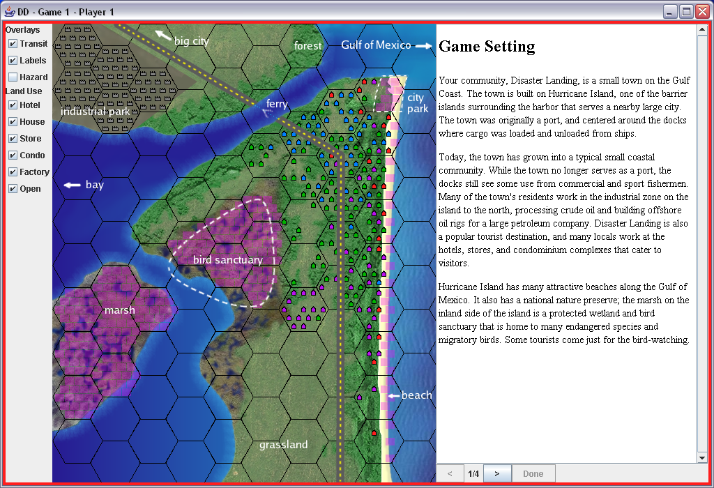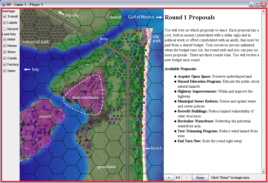The following four screenshots (click to enlarge) show show the introductory materials presented to the players at the beginning of the game. The briefing describes the game setting, explains the players' roles, presents the problem the players face during the first round, and summarizes the proposals available during round 1.